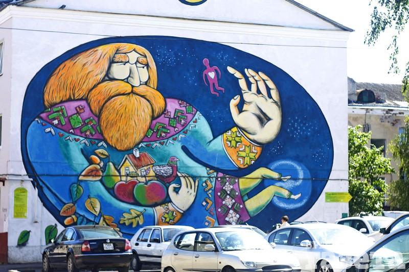 На доме по ул. Советской, 3 разместилось большое граффити от Предка, которое в народе называют «Сотворением мира». Уличный художник известен брестчанам: его работы украшают улицы и нашего города. Только в Витебске они масштабнее. Самая большая работа получилась высотой в три этажа.