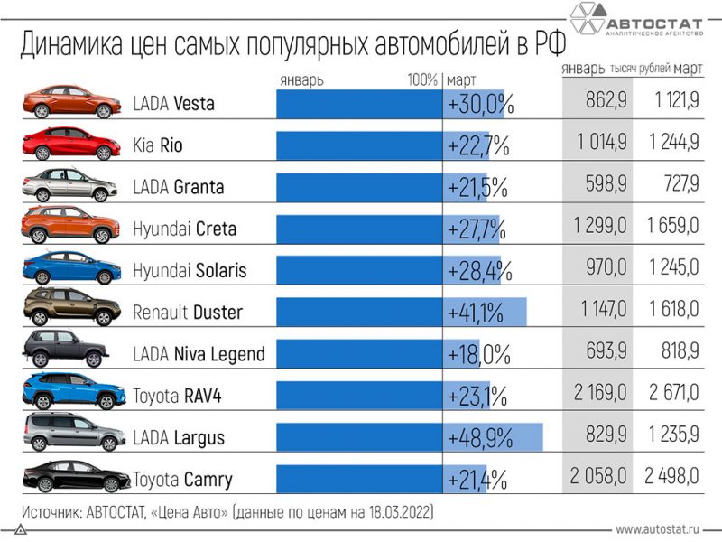 Так, за первые 2,5 месяца нынешнего года самая популярная модель на российском рынке LADA Vesta подорожала сразу на 30%. Минимальная розничная цена на машину сейчас составляет 1 121 900 российских рублей. Стоимость Kia Rio выросла на 22,7% и теперь составляет минимум 1 244 900 рублей. Самой доступной среди популярных десяти моделей пока остается Lada Granta — с минимальной стоимостью в 727,9 тысяч рублей.