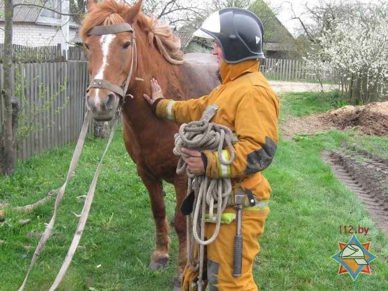 Спасатели обвязали лошадь рукавами, а затем при помощи фронтального погрузчика подняли животное на поверхность, сообщает Брестское областное управление МЧС.