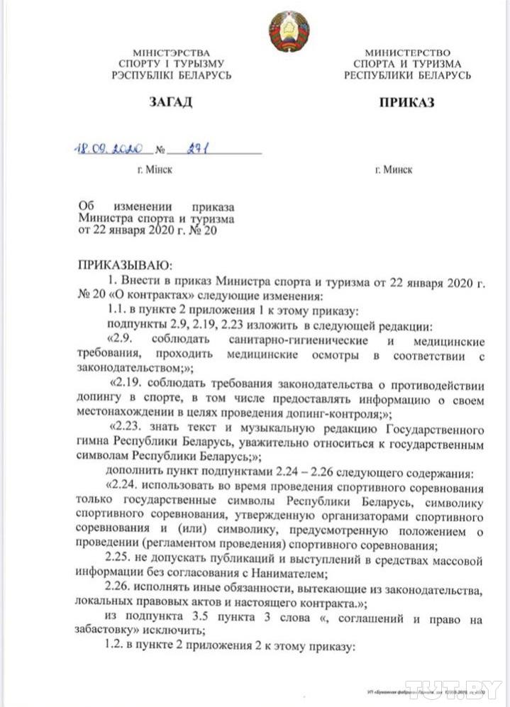 Белорусских спортсменов просят подписать дополнительные соглашения к контрактам, согласно которым они, в частности, обязаны наизусть знать гимн Беларуси, могут использовать только государственную символику, не имеют права давать комментарии СМИ и делать любые публикации без разрешения нанимателя. Приказ, подписанный 18 сентября министром спорта Сергеем Ковальчуком, прислал в редакцию TUT.BY читатель.