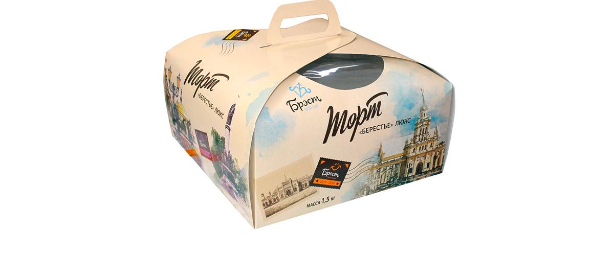 На упаковке праздничного торта можно встретить изображения достопримечательностей Бреста: железнодорожный вокзал, улицу Советскую, Зимний сад, памятник Тысячелетию Бреста.