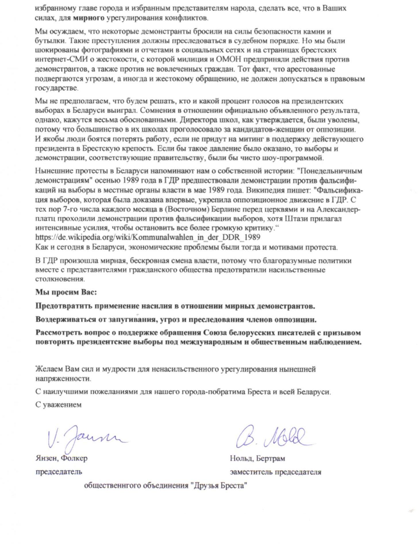 «В ГДР произошла мирная бескровная смена власти, потому что благоразумные политики вместе с представителями гражданского общества предотвратили насильственные столкновения», — отметило ОО «Друзья Бреста» в письме.