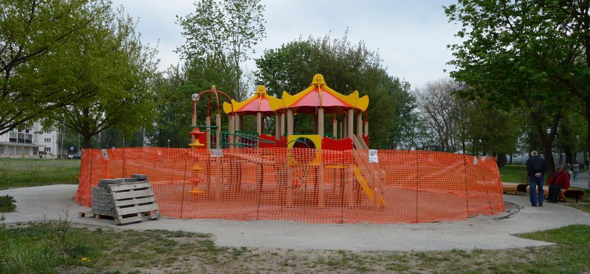 Пока ее не открыли для детей, площадка огорожена строительной сеткой.