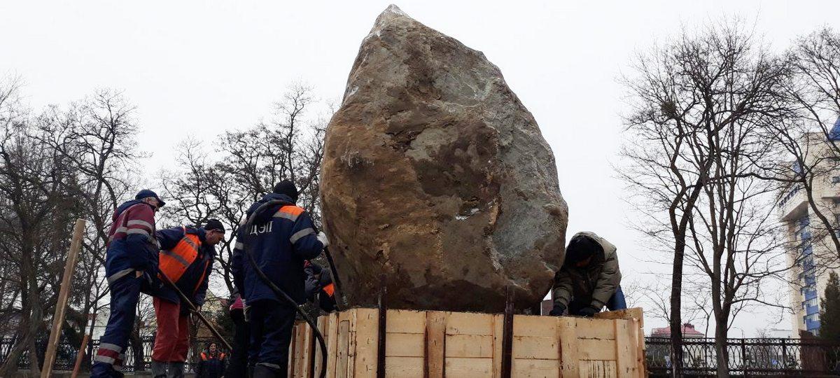 Установкой валуна вечером 13 марта занимались сотрудники ДЭП. Он разместился в центре брестского Городского сада на небольшой насыпи.