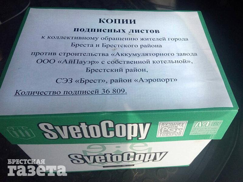 Собранные против строительства завода подписи передали в Администрацию президента. Всего собрали 36 809 подписей. В Администрацию передали копии подписных листов и обращение Александру Лукашенко на 14 страницах.