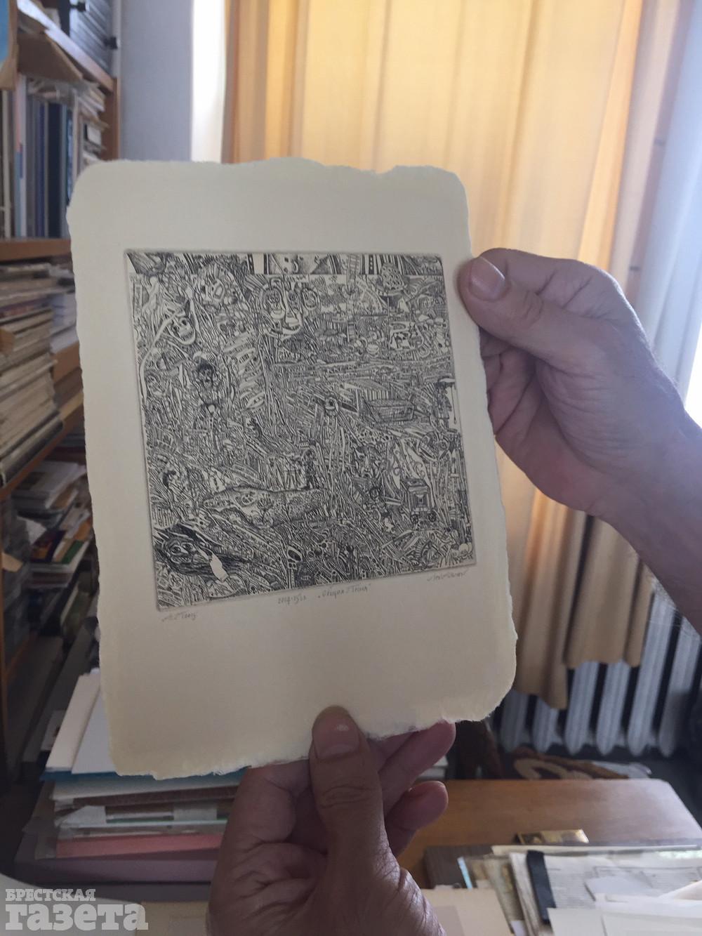 Привычный распорядок дня, как признается мой собеседник, за эти месяцы у него не изменился. Алимов продолжает работать в удобном ему ритме. Среди недавних событий – участие в выставке «Человеку нужен человек», открывшейся в Национальном центре современных искусств Беларуси. В новой экспозиции представлена работа Алимова под названием «Общая песня». Это произведение – коллективное творение двух лет кропотливого труда. Захаживающие в алимовскую мастерскую гости оставляли свои автографы, эта тема и послужила основой гравюры, состоящей из рисунков случайных людей.