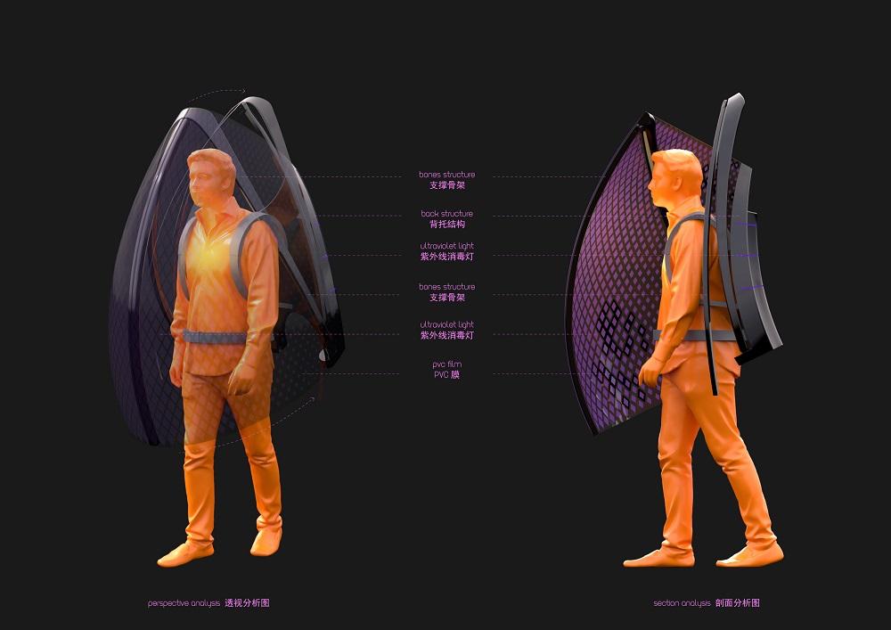 В основании костюма две карбоновых опоры в форме крыльев, которые соединены между собой. Их можно носить как рюкзак. Между опорами натягивается пленка ПВХ, похожая на мембрану крыла летучей мыши. По задумке создателя, провода внутри костюма будут нагреваться до 56°C и вырабатывать ультрафиолетовое излучение, которое простерилизует воздух внутри.