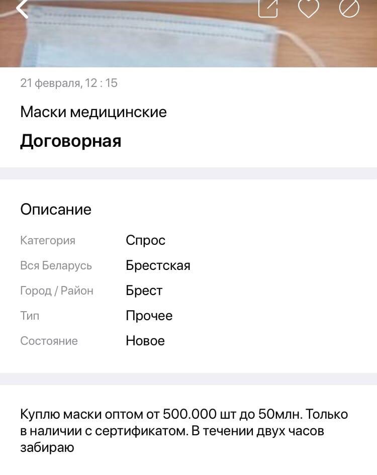 А вот любопытное объявление не о продаже, а о намерении купить маски оптом с сертификатом. Самое интересное здесь – цифры. Покупателю нужно от 500 000 до 50 млн (!) штук. Забрать товар покупатель готов сразу же, в течение двух часов. Объявление подали 21 февраля, и оно все еще актуально.