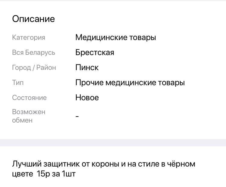 А этот парень из Пинска пошел еще дальше и заявил обычную маску как специальную от коронавируса. «Лучший защитник от короны и на стиле в черном цвете», – говорится в объявлении.