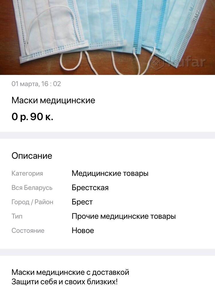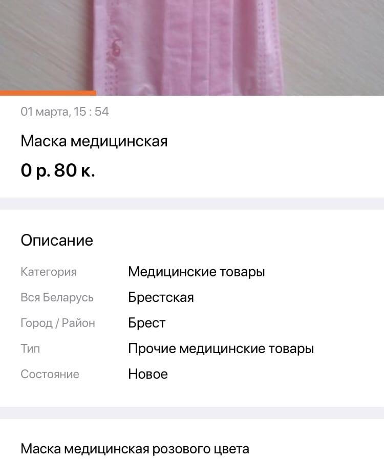 На одном сайте по запросу «маска» в Брестском регионе мы нашли больше 20 объявлений. Можно купить и одноразовые, и марлевые, и маски-респираторы. Цены варьируются от 50 копеек за штуку до 15 рублей.