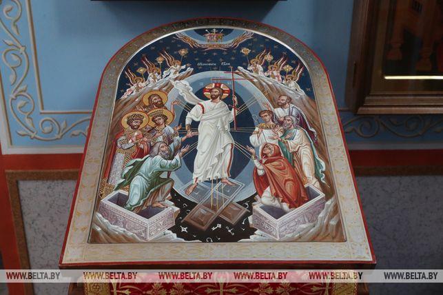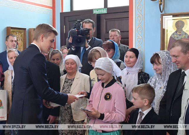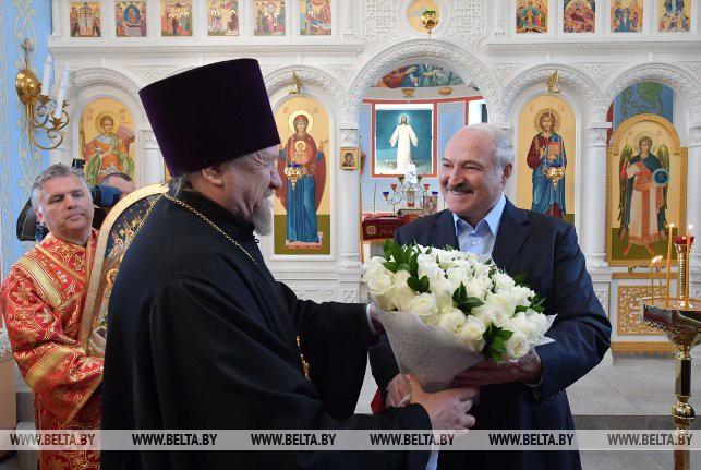 В дар храму Александр Лукашенко передал икону «Воскресение Господне», написанную в мастерской Виктора Довнара по древней византийской технологии, а прихожан угостил шоколадом «Президент», который производится по специальной рецептуре.