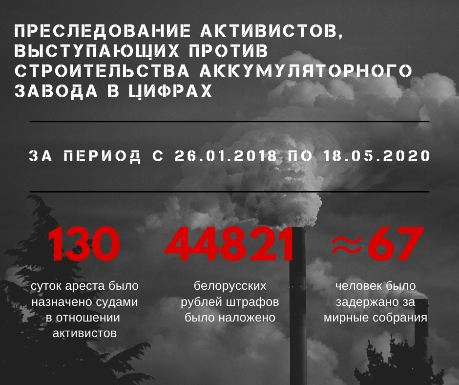 По информации организации, начиная с 2018 года и по 18 мая 2020 года было задержано порядка 67 противников строительства под Брестом аккумуляторного завода (все данные приблизительные, собраны из открытых интернет-источников и получены от активистов — прим. «Экодом»), которых оштрафовали на 1 749 базовых величин (почти 49 тысяч рублей), общая сумма дней ареста — 130 суток.