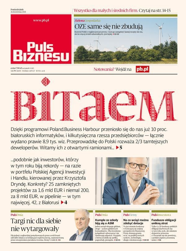 Очередной номер польской газеты Puls Biznesu вышел с довольно приметной для жителей Беларуси обложкой: на главной странице издания крупным шрифтом написано «ВІТАЕМ», при этом в статье говорится о наплыве белорусских айтишников в Польшу.