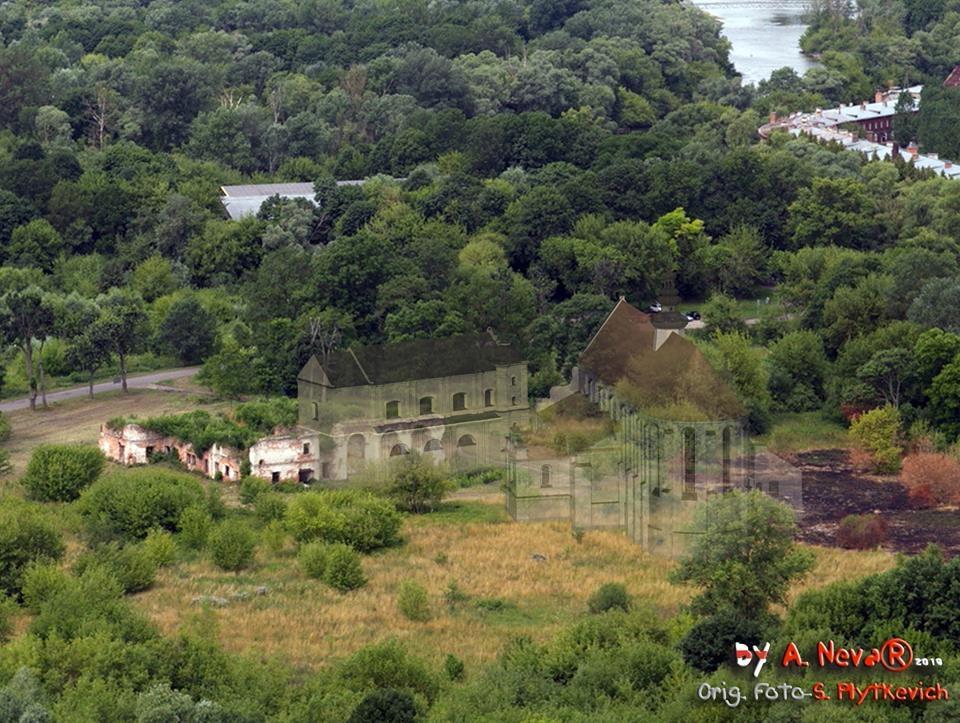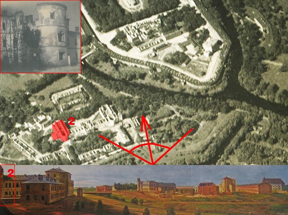 Совмещение аэрофотосъемка в 1915 г. с указанием бывшего костела Иоанна Крестителя и Св. Анны, перестроенных на военный госпиталь (указан красным) и фрагмент его изображения на момент постройки крепости в 1840 г. с акварели Мартина Залесского