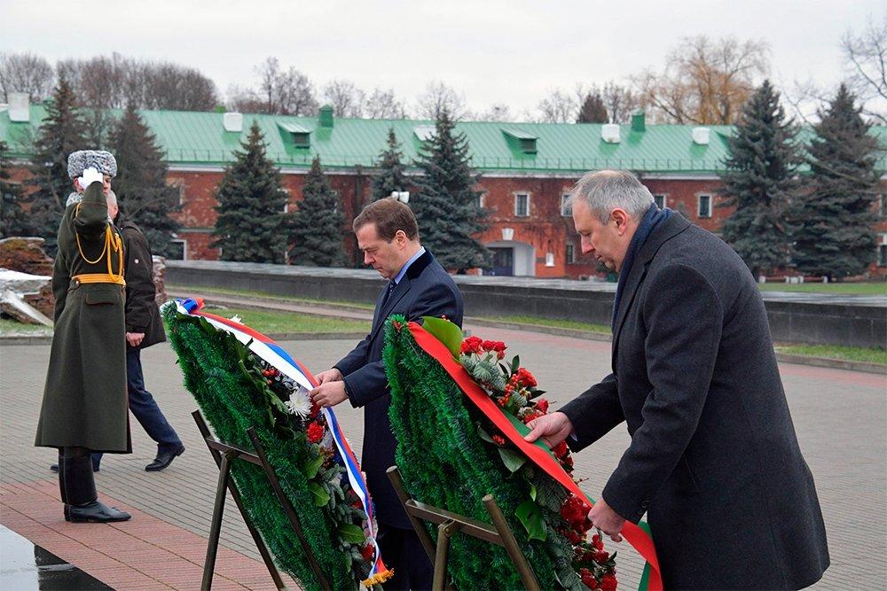 Вместе со своим белорусским коллегой Сергеем Румасом Медведев почтил память погибших защитников крепости — премьеры возложили венки к Вечному огню.