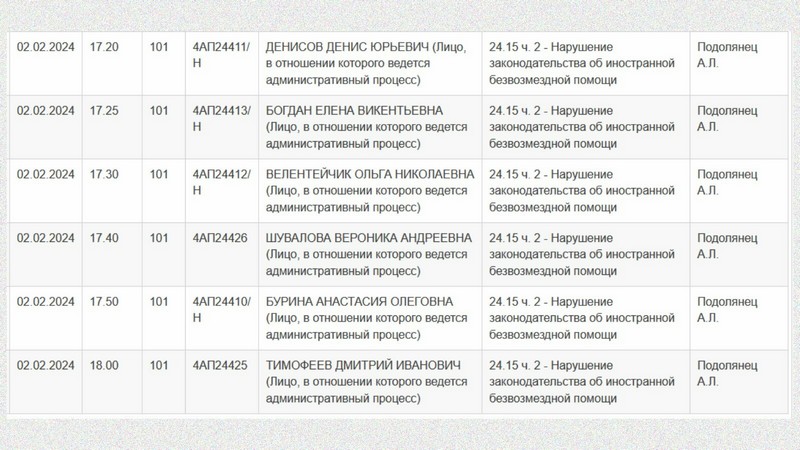 Брестская «Вясна» выяснила, что в Барановичах в пятницу 2 февраля в конце рабочего дня осудили 6 человек по этой статье. В расписании суда значились полные тезки бывших политзаключенных Дмитрия Ивановича Тимофеева и Дениса Юрьевича Денисова, а также еще четырех человек.