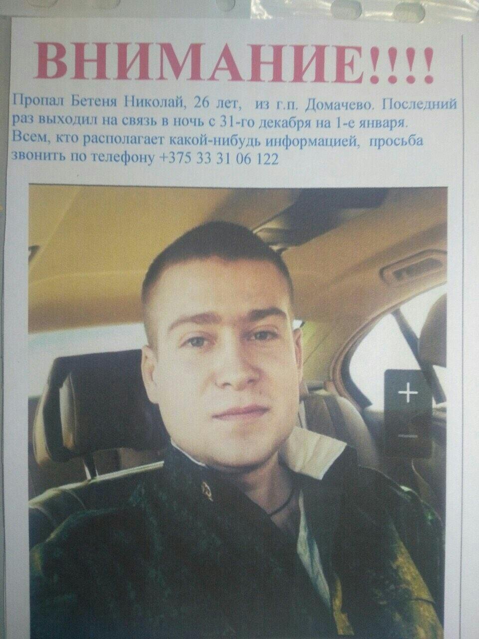 В социальных сетях утром 4 января появилось сообщение о пропаже 26-летнего Николая Бетени, проживающего в г. п. Домачево. Последний раз мужчина выходил на связь в ночь с 31 декабря на 1 января. «ВКонтакте» на своей странице с тех пор он тоже не появлялся – «заходил 31 декабря 2018 в 21.55».