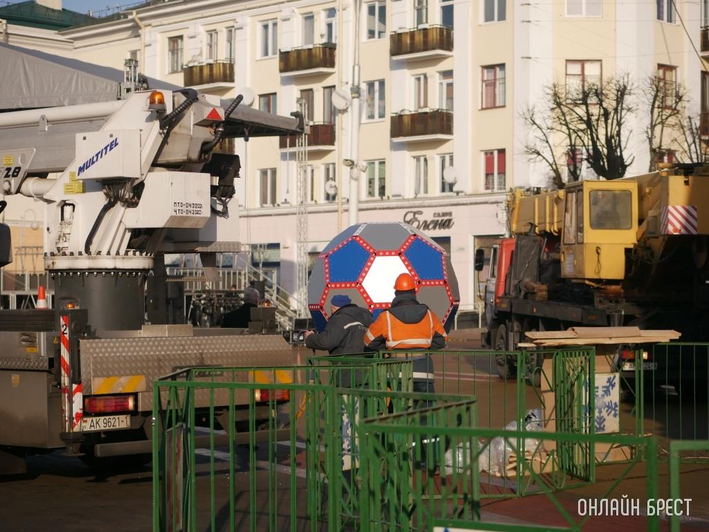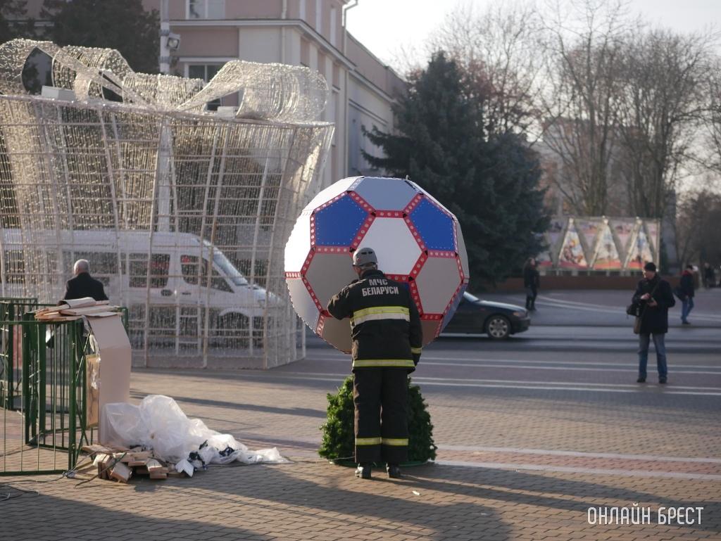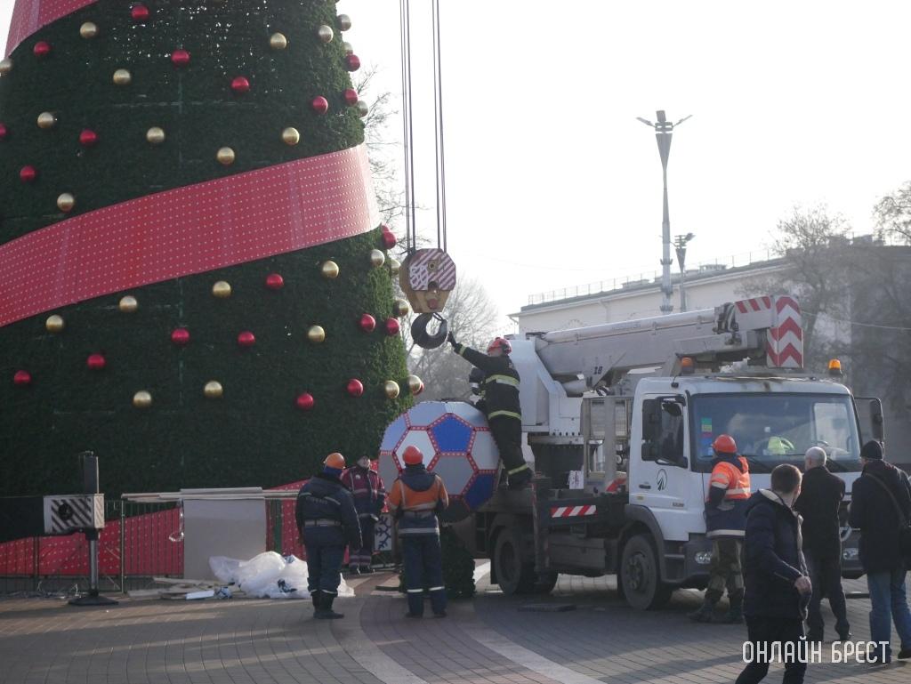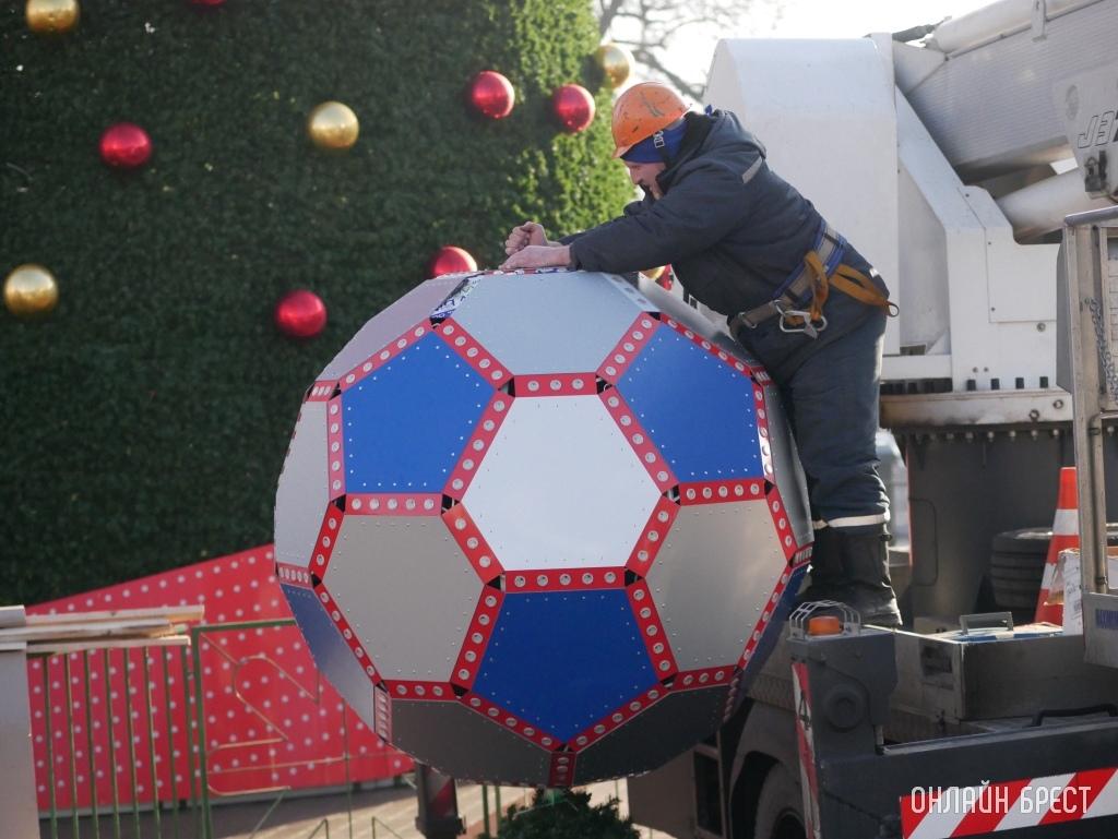 Днем 20 декабря на главной елке Бреста на площади Ленина появился обещанный футбольный мяч. Его установку запечатлел на фото «Онлайн Брест».