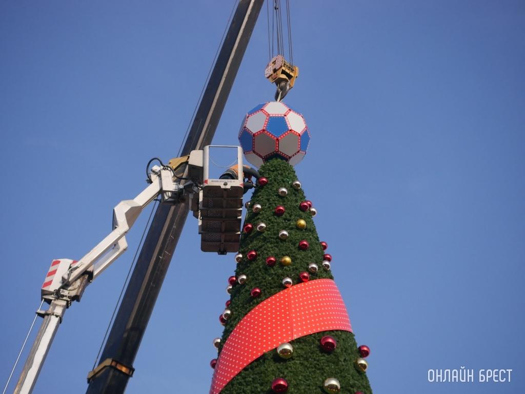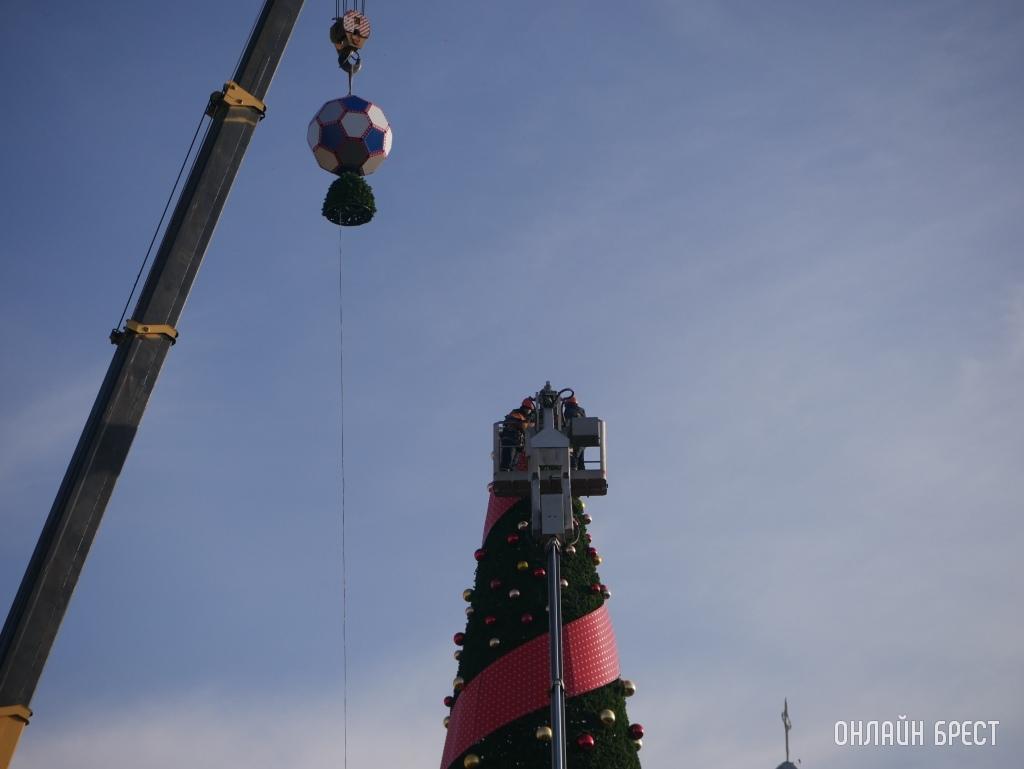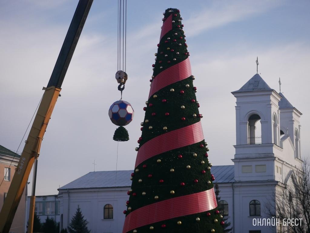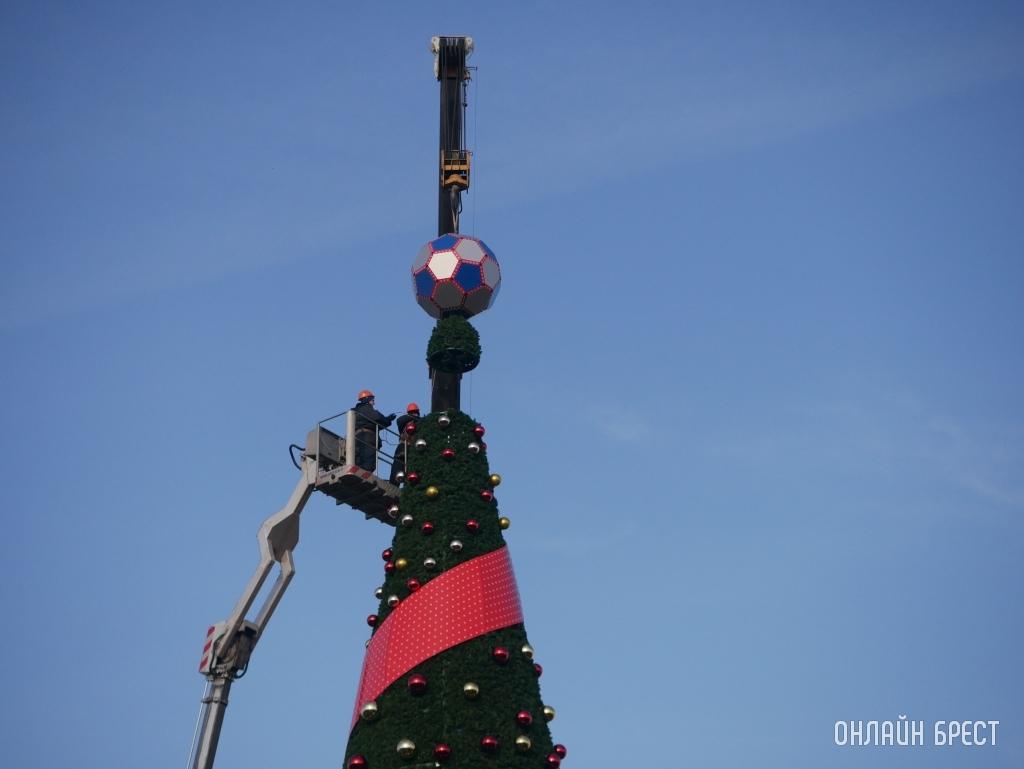 Посмотрите, как выглядит главная елка Бреста с футбольным мячом на верхушке (много фото + видео)