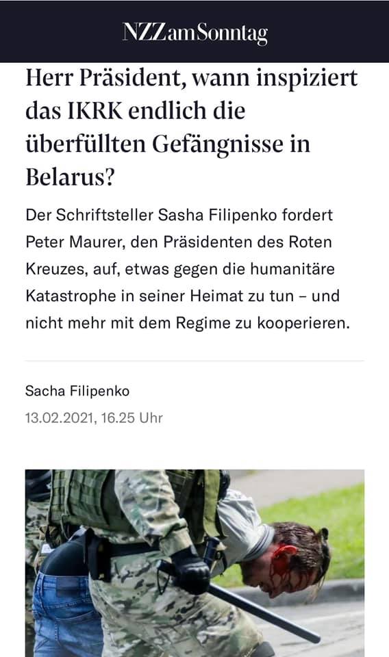 Крупная швейцарская немецкоязычная газета Neue Zürcher Zeitung опубликовала открытое письмо белорусского писателя Саши Филипенко к президенту Международного Комитета Красного Креста Петеру Мауреру.
