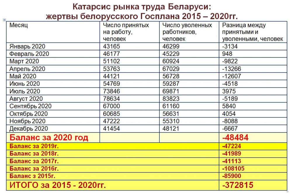 2. За 2020 год было уволено на 48,5 тысяч больше человек, чем принято на работу. Это максимальное число за последние четыре года. С 2015 по 2020 год число уволенных превысило число принятых на работу почти на 373 тысячи.