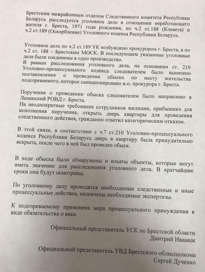 Брестским межрайонным отделом Следственного комитета Республики Беларусь расследуется уголовное дело в отношении неработающего жителя Бреста 1971 года рождения по ч. 2 ст. 188 (Клевета) и ч. 2 ст. 189 (Оскорбление) Уголовного кодекса Республики Беларусь.