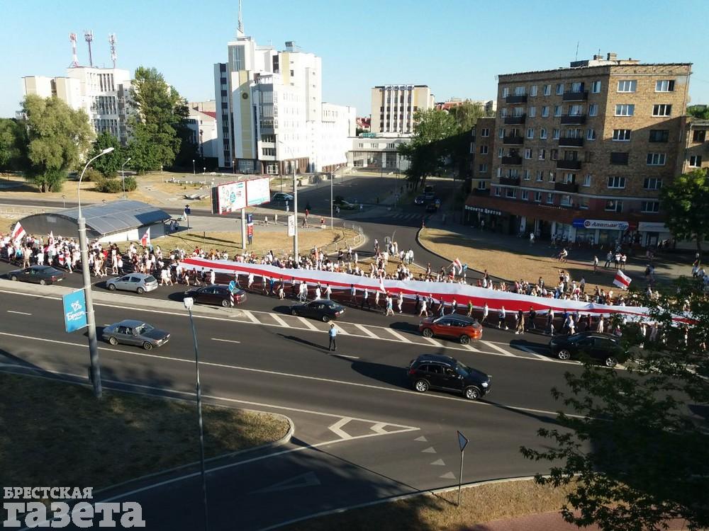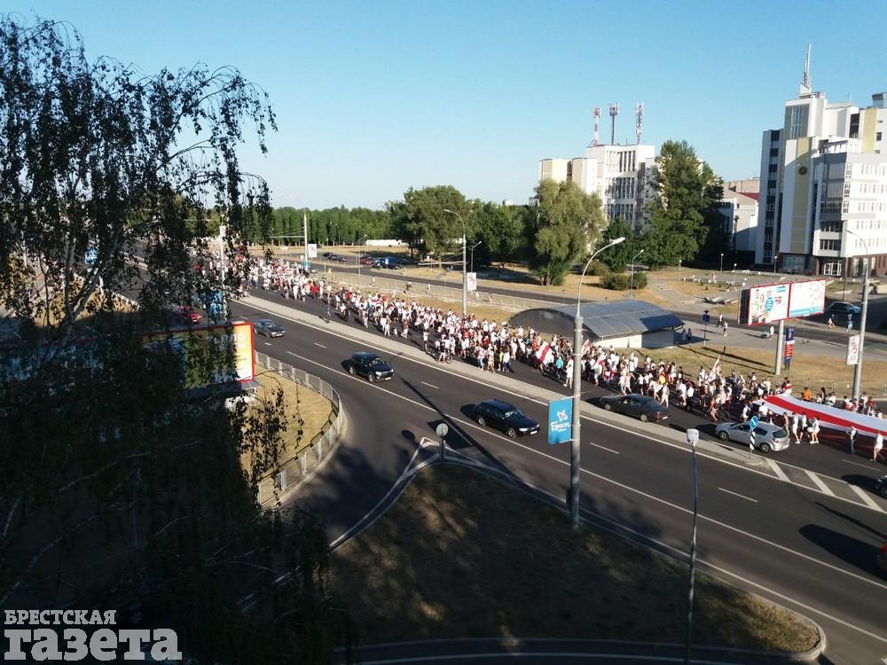 Напомним, в субботу 15 августа многотысячная колонна брестчан прошла с Машерова на улицу Московскую. На перекрестке с проспектом Республики толпа повернула направо, перешла Гузнянский мост и пошла по улице Суворова. Колонна прошла по Волгоградской, 28 Июля и Варшавскому шоссе до перекрестка с бульваром Шевченко. Здесь участники шествия повернули направо, на мост через Мухавец. Колонна перешла мост, дошла до проспекта Машерова, повернула налево и возле ЦУМа остановилась.