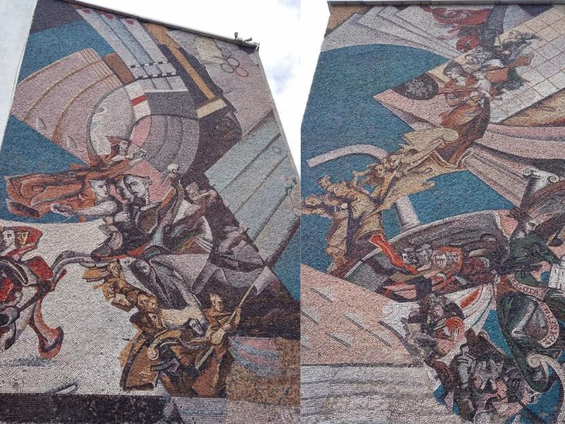Почему мозаики закрасили, неизвестно. Возможно, все дело в изображенной на них беларуской национальной символике: бело-красно-белых флагах и гербе «Погоня» (напомним, он является историко-культурной ценностью и внесен в Государственный список историко-культурных ценностей Беларуси).