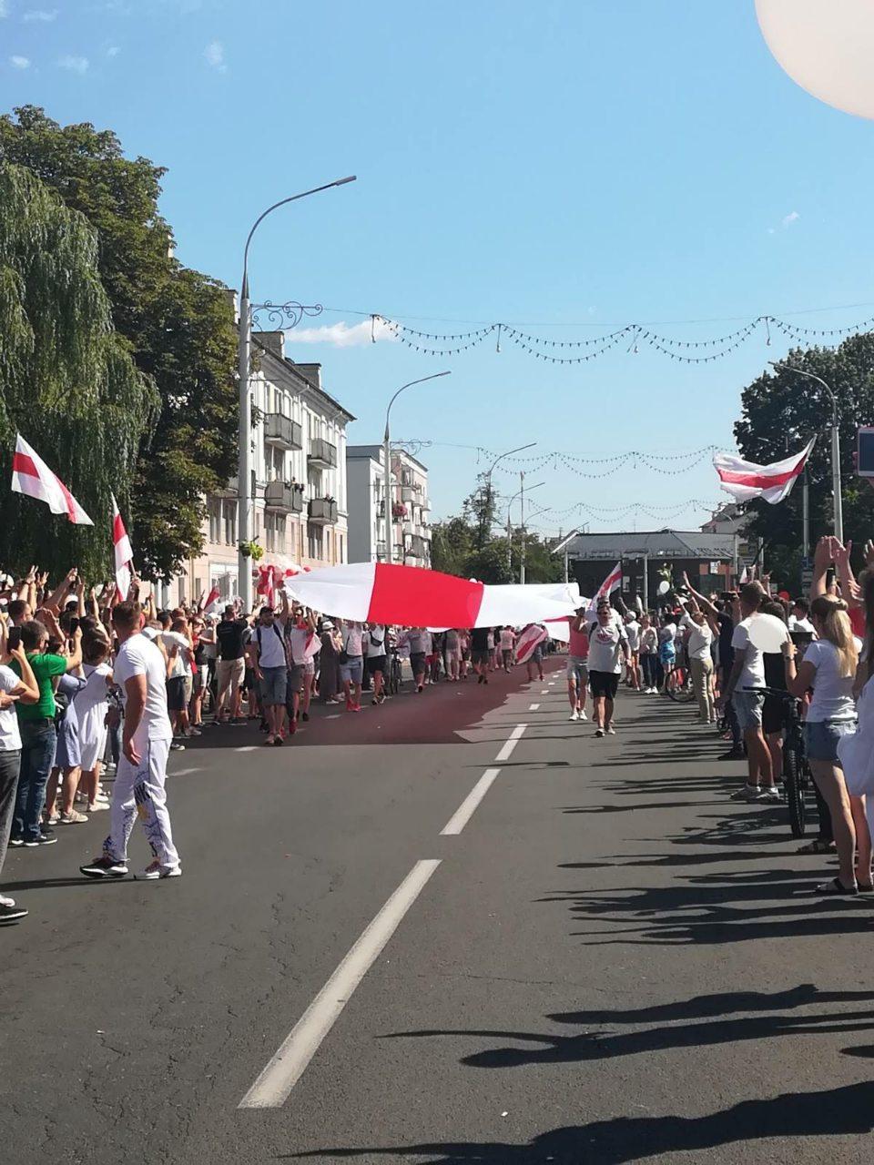 Брестчане растянули бело-красно-белый флаг длиной в 100 метров. Люди все еще подтягиваются к площади.
