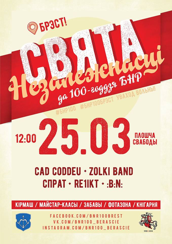 100-летие принятия 3-й уставной грамоты Рады БНР, объявившей независимой Белорусскую Народную Республику, отметят митингом и уличным фестивалем с концертом, розыгрышем призов, ярмаркой товаров белорусских ремесленников.