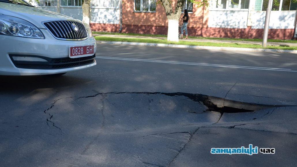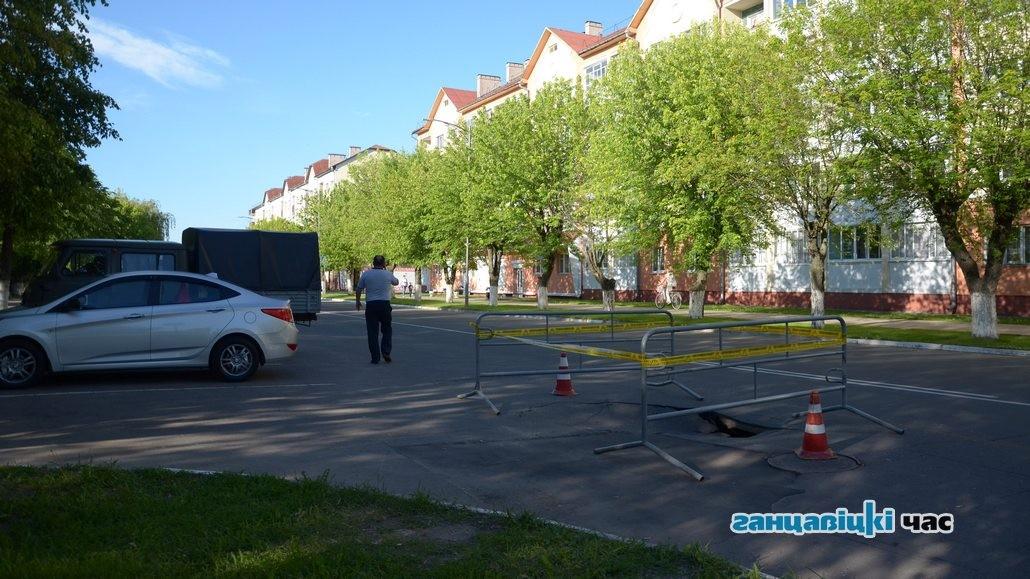Асфальт провалился на главной улице в Ганцевичах – Октябрьской – вечером 31 мая. Произошло это буквально в пару сотнях метров от площади. На месте провала на проезжей части поставили металлическое ограждение, так как яма серьезная, сообщает ganc-chas.by.