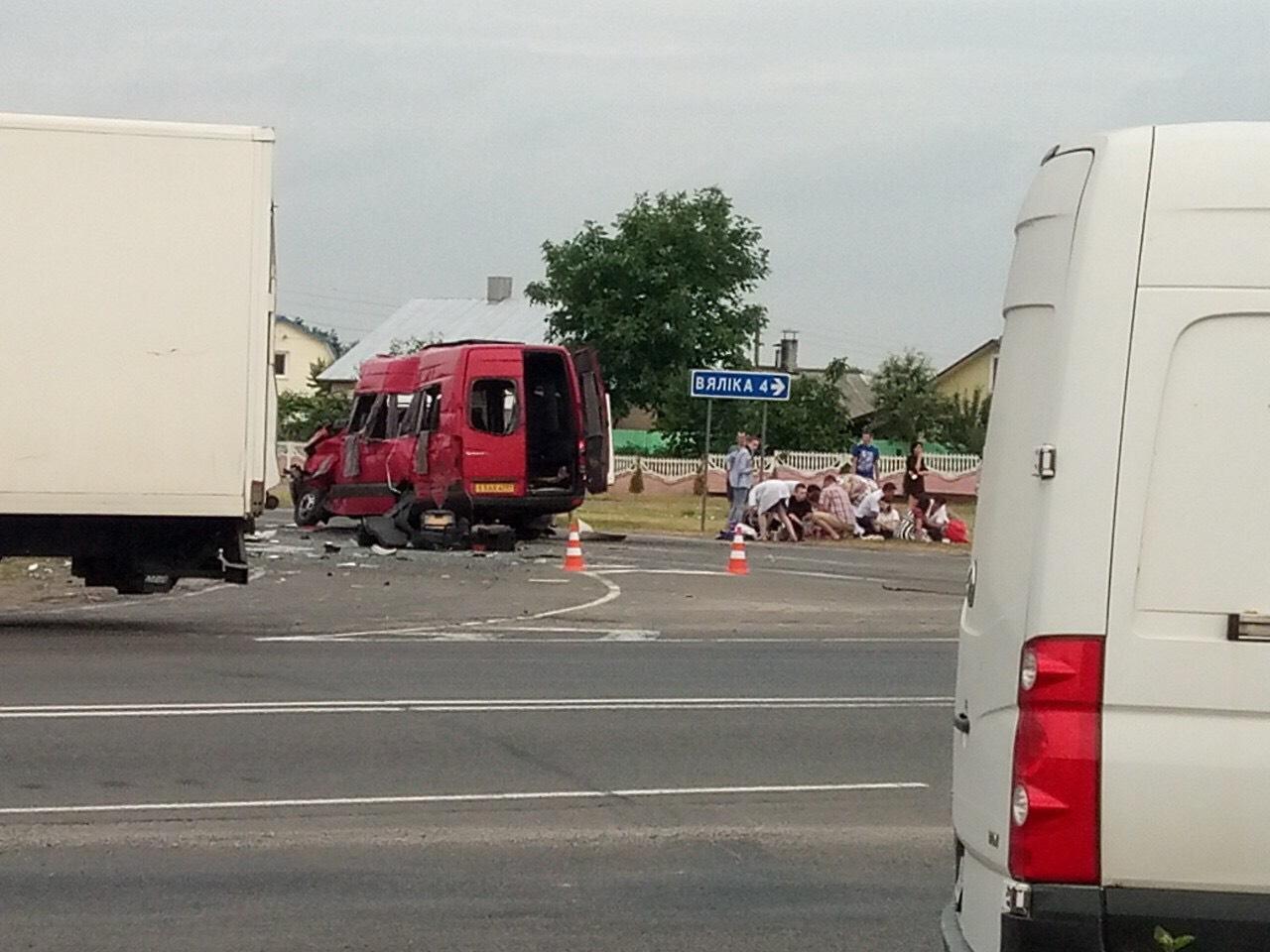 Страшная авария произошла утром 21 июня в Видомле Каменецкого района. Как сообщают пользователи в соцсетях, у фуры отказали тормоза и она буквально протаранила маршрутное такси, которое ехало в Брест из Беловежской пущи. По предварительным данным, пострадали около 17 человек. О погибших информации на 11 утра нет.