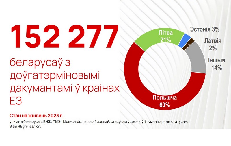 Также АВВА удалось посчитать количество беларусов с долгосрочными документами в странах Евросоюза — 152 277. 60% из них проживают в Польше, 21% — в Литве, 3% — в Эстонии, 2% — в Латвии, 14% — в других странах ЕС.