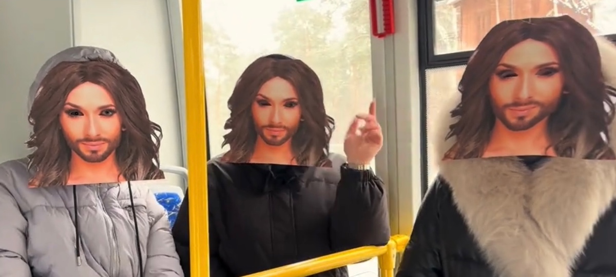 «Шедевр» идеологов «Гранита» подходит к кульминации: главный герой забегает в автобус, в котором сидят трое человек с масками Кончиты Вурст.