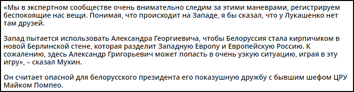 Цитата: «Запад пытается использовать Александра Георгиевича, чтобы Белоруссия стала кирпичиком в новой Берлинской стене, которая разделит Западную Европу и Европейскую Россию. К сожалению, здесь Александр Григорьевич может попасть в очень узкую ситуацию, играя в эту игру».