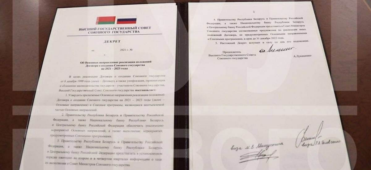 Декрет «Об основных направлениях реализации положений Договора о создании Союзного государства на 2021 -2023 годы», подписанный Лукашенко, Мишустиным и Головченко.