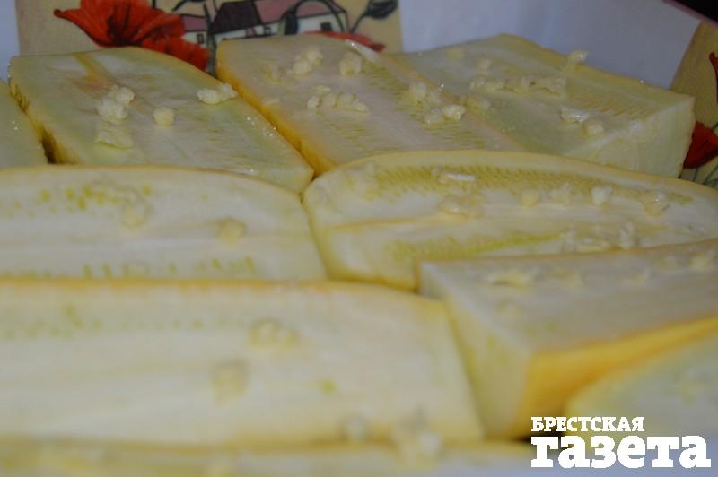 Посолите и поперчите. Чеснок очистите от шелухи и пропустите через пресс. Натрите измельченным чесноком кабачки.