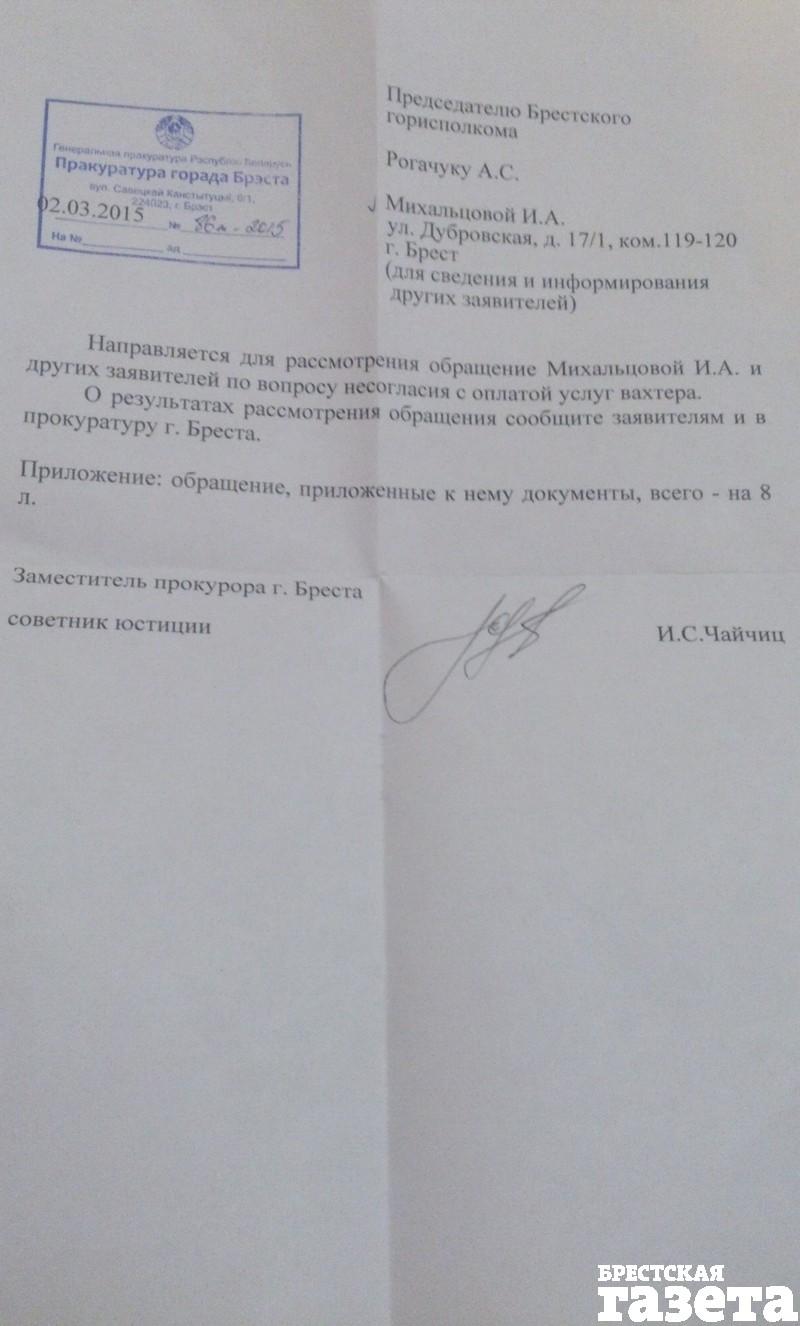 — После получения жировок с графой «услуга вахтеров», где одним жильцам предлагалось заплатить тысяч 70, другим 120, а некоторым и свыше 200 тыс. рублей, мы собрали подписи всех, кто против этих поборов, — отследил дальнейший ход событий Николай. — Письмо в прокуратуру, под которым подписались жильцы, нам составил юрист, который достаточно четко, со ссылкой на действующее законодательство, показал, что взимание с жильцов платы на содержание вахтеров неправомерно. Проигнорировали это письмо только те, кто живет в общежитии на птичьих правах и боится привлечь к себе внимание. Все остальные его подписали. Из прокуратуры мы на днях получили ответ, что наше письмо для разбирательства направлено председателю горисполкома. Он-де должен дать ответ и прокуратуре, и жильцам. Так что эпопея еще в самом разгаре.