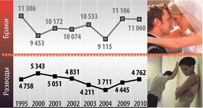 На бракоразводную статистику даже високосный год влияет, когда число регистрируемых отношений заметно снижается, что уже говорить про экономические кризисы и прочие факторы. К тому же с годами численность населения области заметно уменьшилась: 1 млн 497 тысяч в 1995 г. против 1 млн 394 тысяч на 1 января 2011 г. Соответственно, стало меньше женихов и невест. Но статистика браков и разводов в области за 2010 год почти такая же, как и 15 лет назад. Может, не все так плохо?