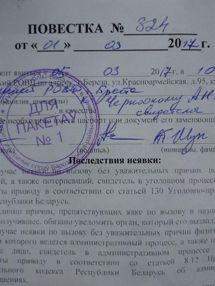 «Милиция начала работать и по воскресеньям. Вызывают уже в Брест, 5 марта, в 10.00. Повестка с доставкой на дом», — написал у себя на странице в Фейсбуке Кабанов.