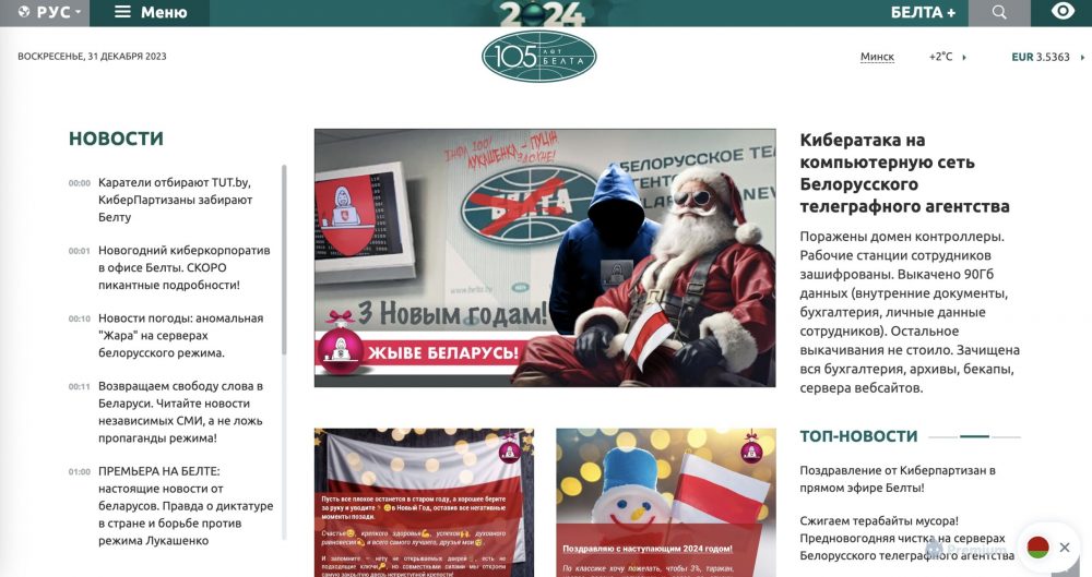 Главным предновогодним событием стал взлом «Киберпартизанами» компьютерной сети государственного информагентства БЕЛТА. Около 10 минут сайт по-настоящему радовал глаз.
