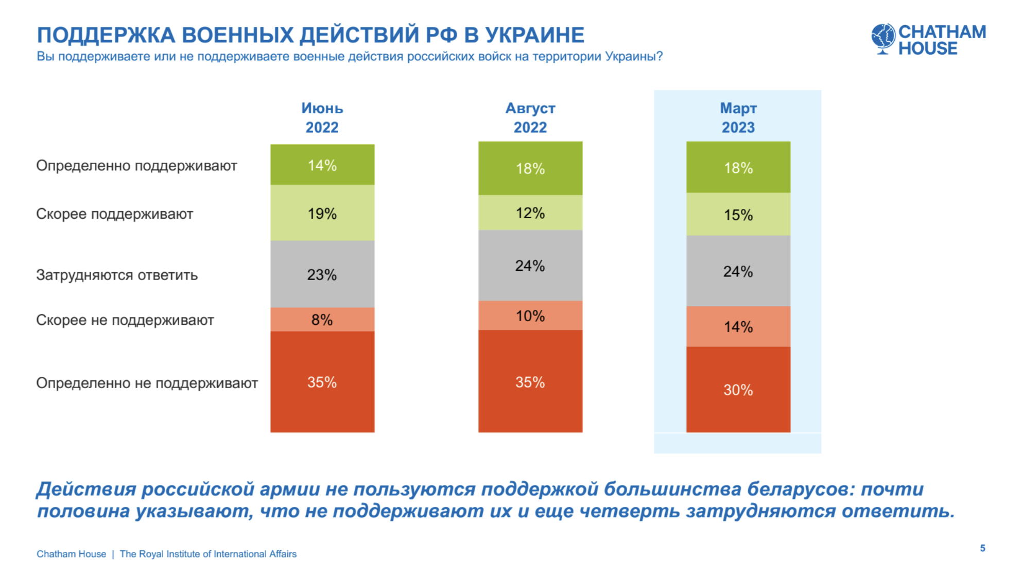 В беларуском обществе нету доминирующей оценки того, какая армия более успешна, но действия российских войск называются эффективными чаще, чем действия украинских. За год войны беларусы несколько чаще стали сомневаться в победе Украины в противостоянии с Россией. Так, например, в марте 2022 года 21% опрошенных уверено верили в победу Украины, а в марте этого года процент таких людей опустился на уровень 15.