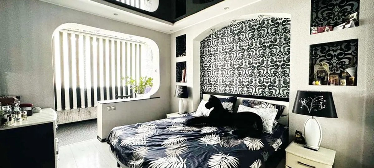 В спальне внимание на себя перетягивает, пожалуй, непривычная планировка с нишами в стене и витиеватые узоры. Из-за стилизованной лоджии, плавности линий на предметах мебели и стенах интерьер комнаты выглядит более уютным и мягким.