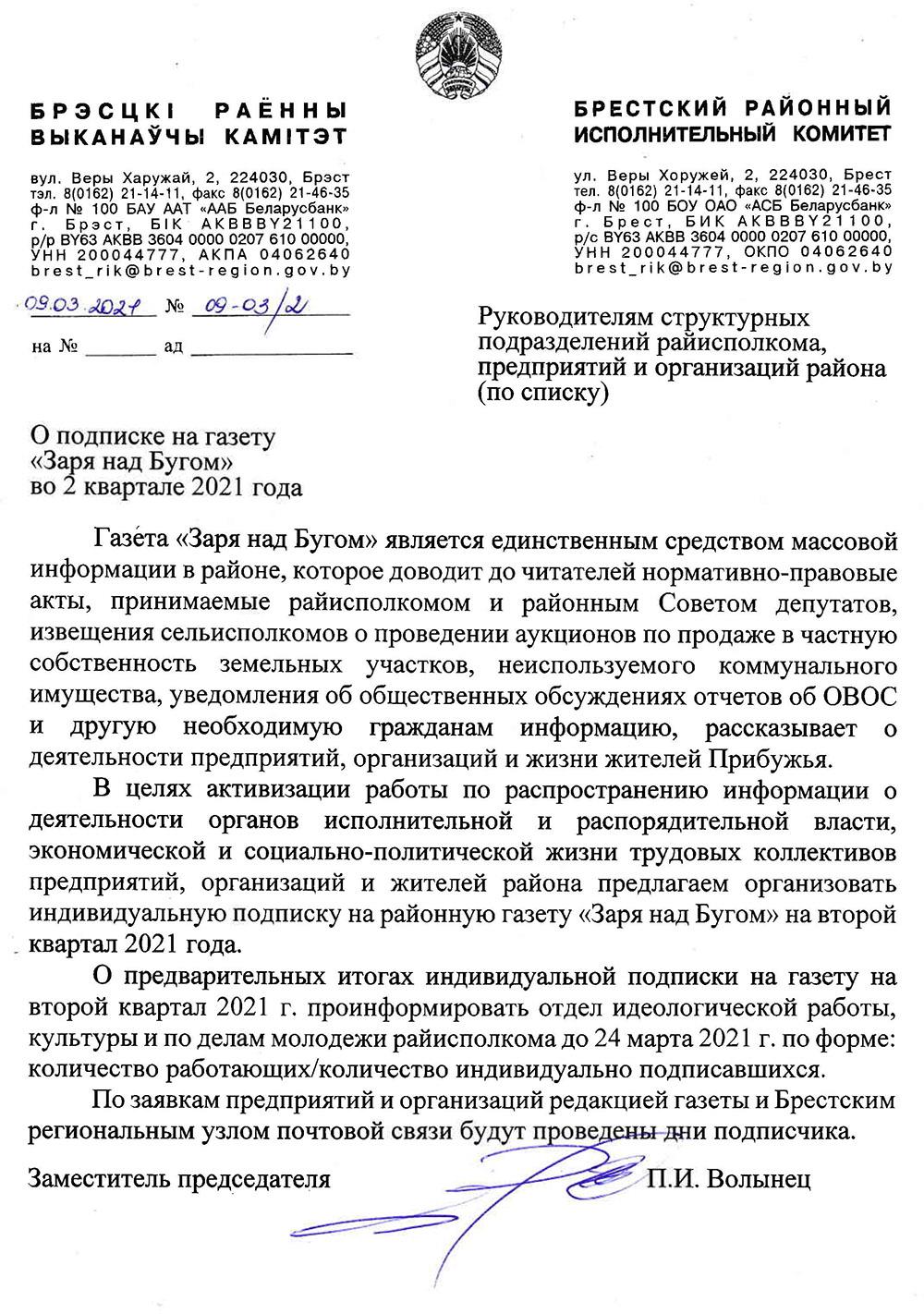 Эту часть цитируем полностью: «В целях активизации работы по распространению информации о деятельности органов исполнительной и распорядительной власти, экономической и социально-политической жизни трудовых коллективов предприятий, организаций и жителей района предлагаем организовать индивидуальную подписку на районную газету «Заря над Бугом» на второй квартал 2021 года».