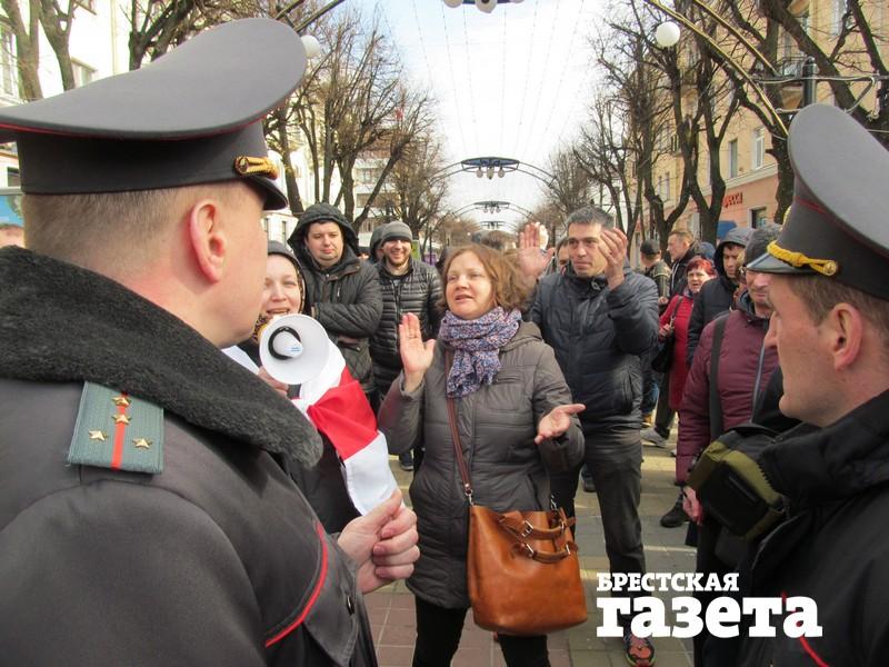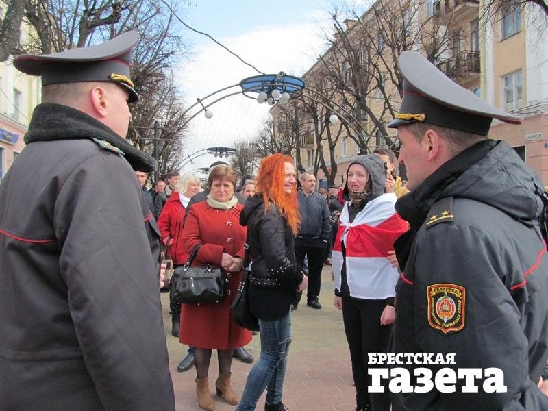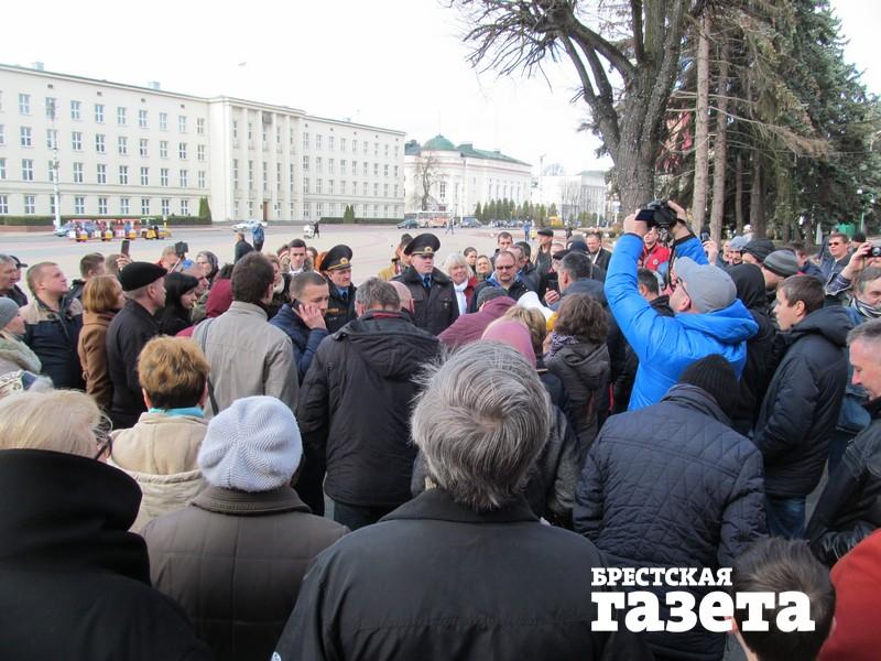 Полина Шарендо-Панасюк через мегафон призывает людей на площадь. Вокруг нее собрались люди. Она говорит, что основная акция состоится 25 марта в Минске на День Воли. Подошла милиция. Люди защищают ее. Наряд предупреждает об административной ответственности.