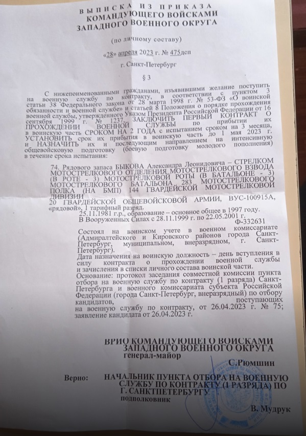 После этого рядового запаса Быкова зачислили стрелком в батальон 283-го полка 144-й гвардейской мотострелковой дивизии. Это соединение входит в состав 20-й гвардейской общевойсковой армии Западного военного округа.