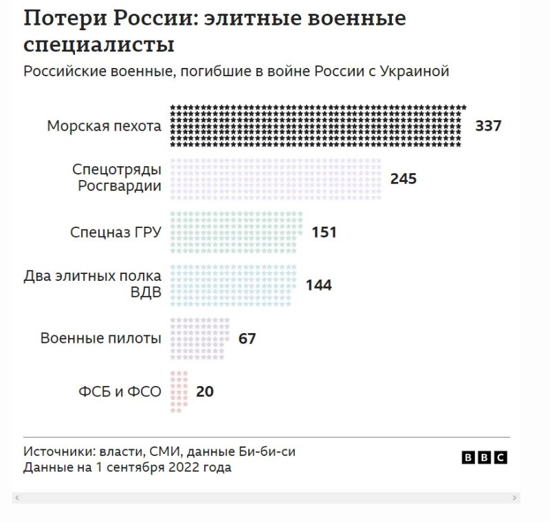 Особенно высока доля потерь среди офицеров спецназа — как в ГРУ, так и в отрядах Росгвардии. Командирские звезды носил практически каждый четвертый погибший сотрудник спецподразделений.