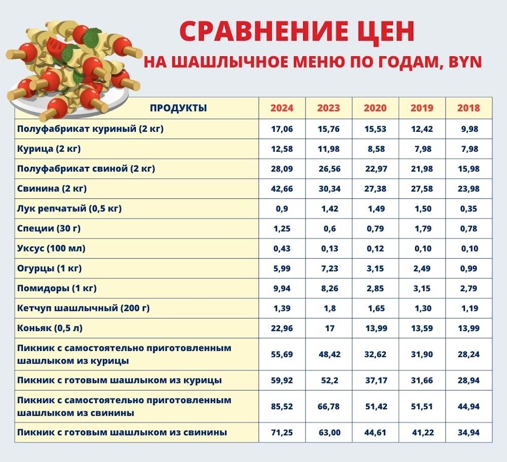 Так, пикник на компанию из четырех человек с самостоятельно приготовленным шашлыком из свинины обойдется этой весной как минимум в 85,52 BYN (в 2023 году это же удовольствие стоило 66,78), из курицы – в 55,69 BYN (52,2 рубля – год назад и 28,24 BYN– в 2018-м).