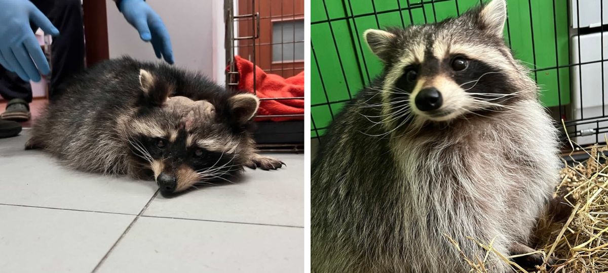 По ее словам, у енота из-за плохого питания начала выпадать шерсть на голове. Животному требуется восстановление и уход.