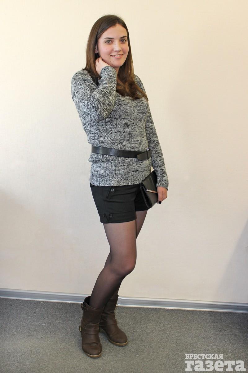 Ирине стилист советует экспериментировать с цветными колготками баклажанного, темно-зеленого, темно-синего оттенков. Они отлично будут смотреться с черными шортами, которые есть в ее гардеробе.